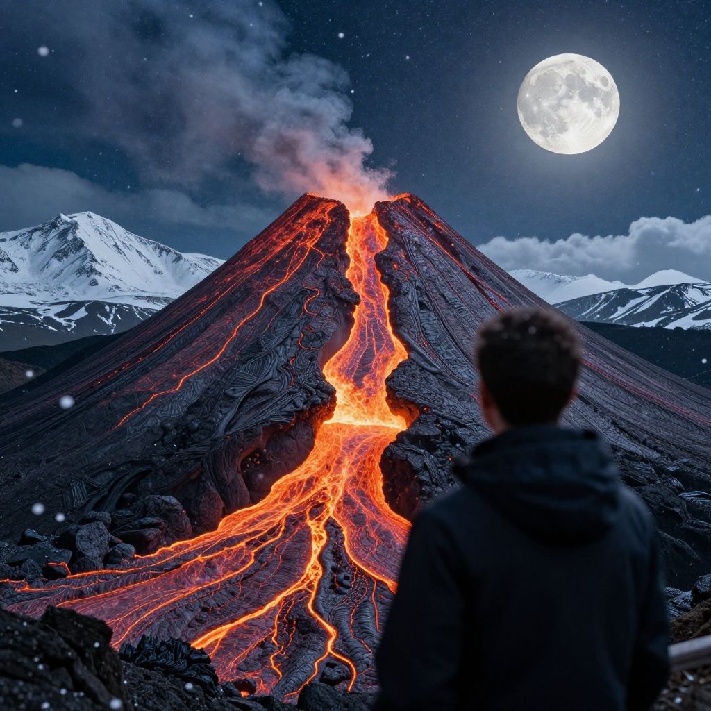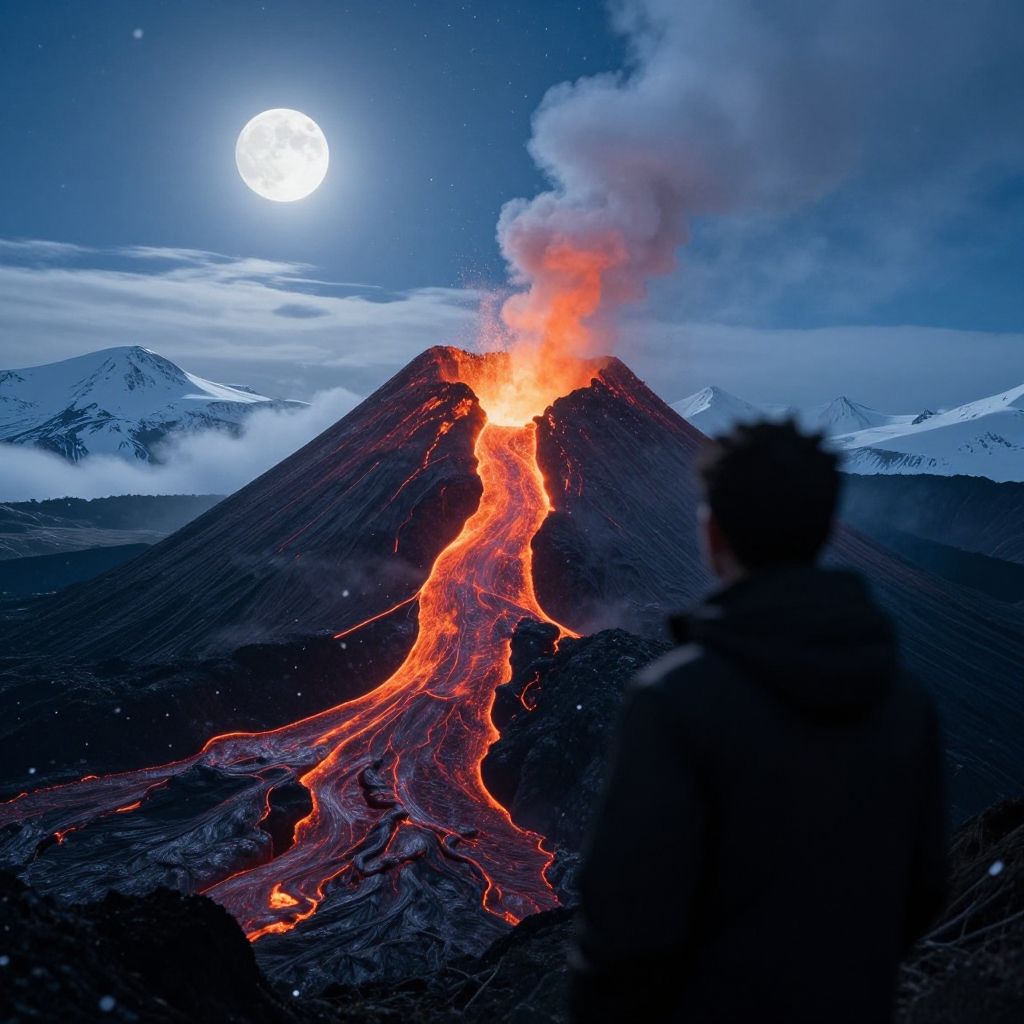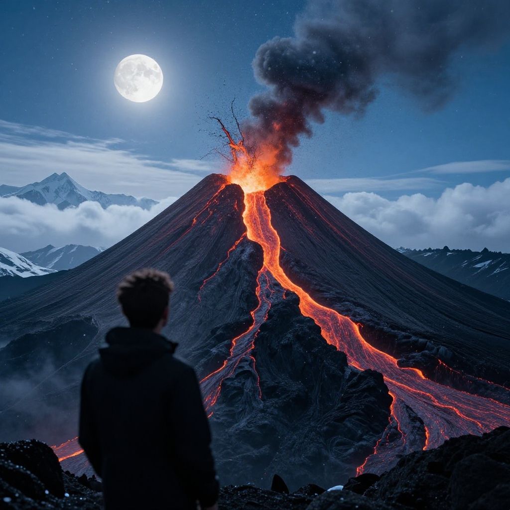 Masterpiece, best quality, ((LEGO art style)), hyper realistic, shadow of man looks at a beautiful volcano, with lave dripping, hot lava, intricate detail, tilt shift, distant view background, snow, clouds, snowfall, snowflakes, moonlight, full moon, excellent cinematography, clear moon, 8k UHD