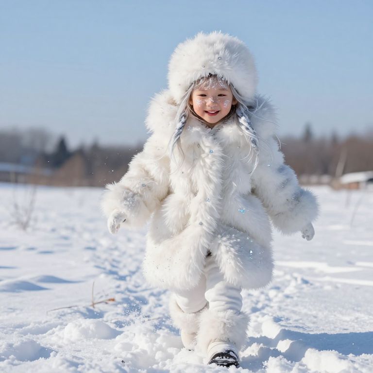 Photograph of a smiling child in a fluffy white winter coat and hat, running through a snowy field under a clear blue sky.