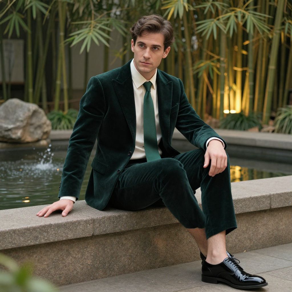 A man, brown checkered tweed suit, cream dress shirt, forest green knitted tie, tan leather derby shoes, quaint garden courtyard, bubbling fountain, colorful flower beds, soft focus, warm sunlight, relaxed smile, serene expression. Man has masculine face and piercing eyes