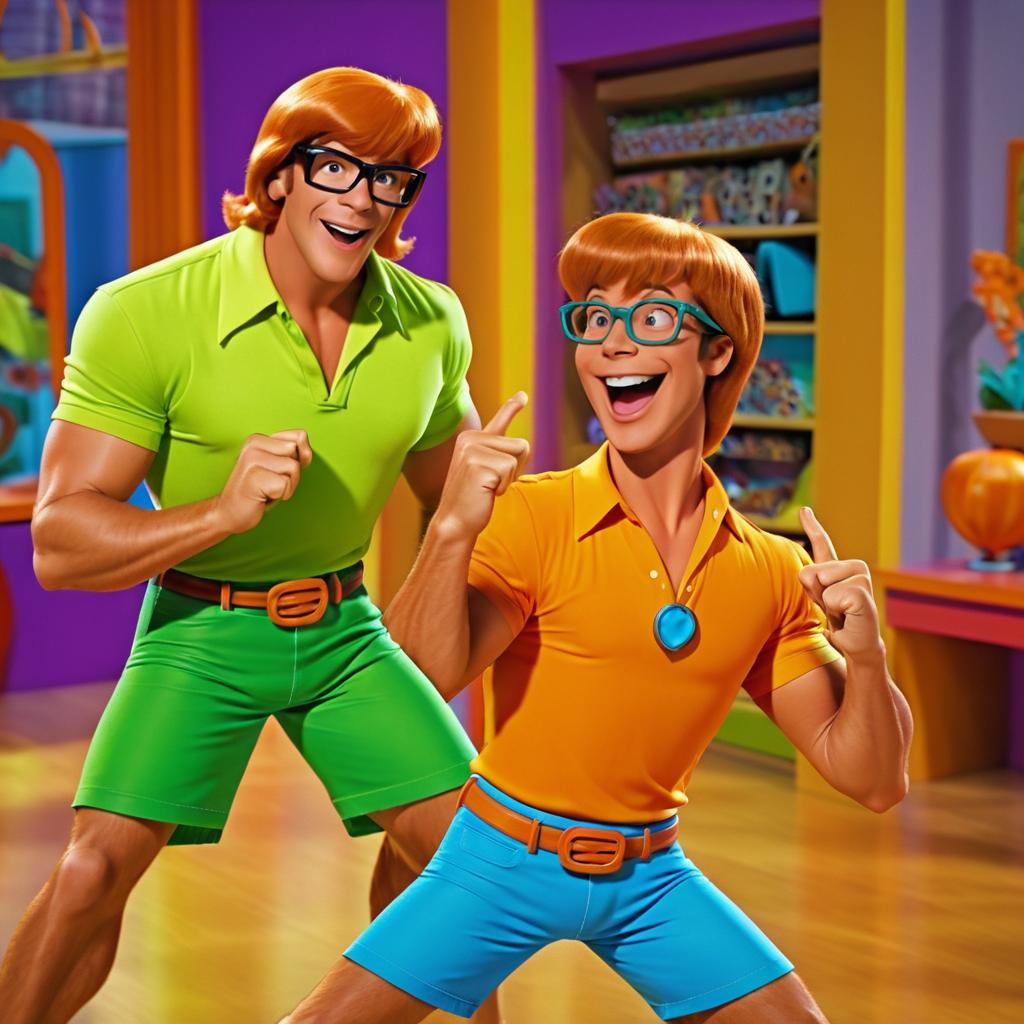 Animated scene featuring Scooby-Doo and Shaggy in a vibrant, colorful living room. Shaggy is wearing a blue and orange shirt with blue shorts, glasses, and white shoes, while Scooby-Doo sports a green shirt and purple collar. Both characters are striking a playful and humorous pose, emphasizing their lighthearted friendship in a cartoon style environment.