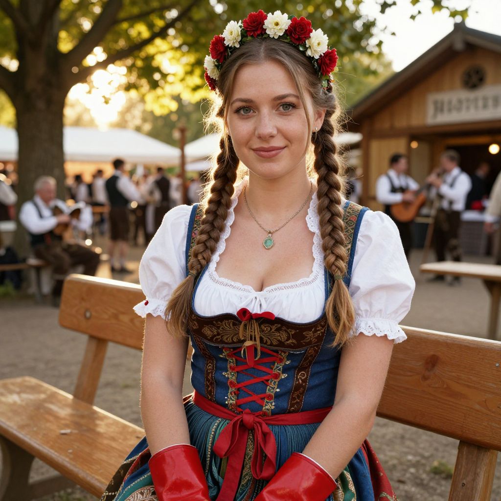 A close-up portrait of a woman in a detailed Oktoberfest costume — a vintage German village peasant dress with braided hair, red boots, and a floral headdress — sitting on a wooden bench in a rustic Oktoberfest village square, with golden afternoon light filtering through trees and distant traditional music playing.. The woman has big tits and cute face