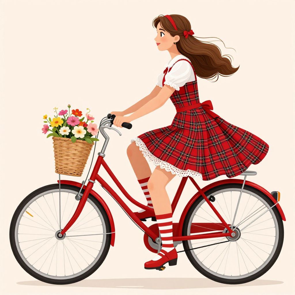 This digital illustration depicts a young woman with long brown hair, wearing a red plaid dress with a white blouse and red headband, riding a bright red bicycle. She has white socks with red stripes and black shoes. A wicker basket filled with colorful flowers is attached to the front of the bike. She is riding to the right, with a joyful expression on her face. The background is plain white, emphasizing the vibrant colors and details of the bicycle and her attire.