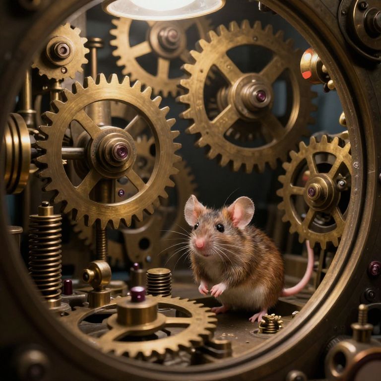 Mouse's view inside an old-fashioned clockwork workshop, gears and springs towering around, warm metallic tones, intricate mechanical details, mouse exploring with awe, steampunk-inspired environment, high detail and contrast.