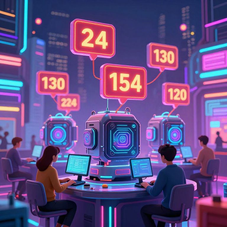 This digital CGI image depicts a futuristic, neon-lit trading room. Three computer operators, two men and one woman, sit at round desks, focused on glowing blue screens with illuminated neon numbers "24," "130," and "154" hovering above. The background features tall, illuminated cityscape silhouettes and vibrant neon lights in pink, blue, and purple. The operators wear casual attire; the woman in a yellow top and the men in blue and grey shirts. The desks are modern with sleek, metallic surfaces. The overall atmosphere is high-tech and bustling, with a vivid, colorful aesthetic.