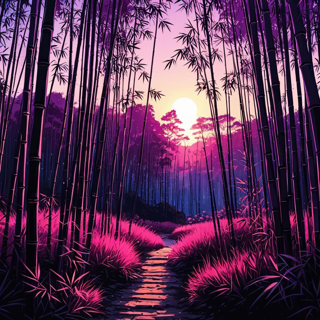 Digital painting of a serene bamboo forest at sunset with vibrant pink and purple hues. The glowing backlight highlights tall bamboo stalks and dense foliage along a stone pathway, creating a tranquil and peaceful ambiance.