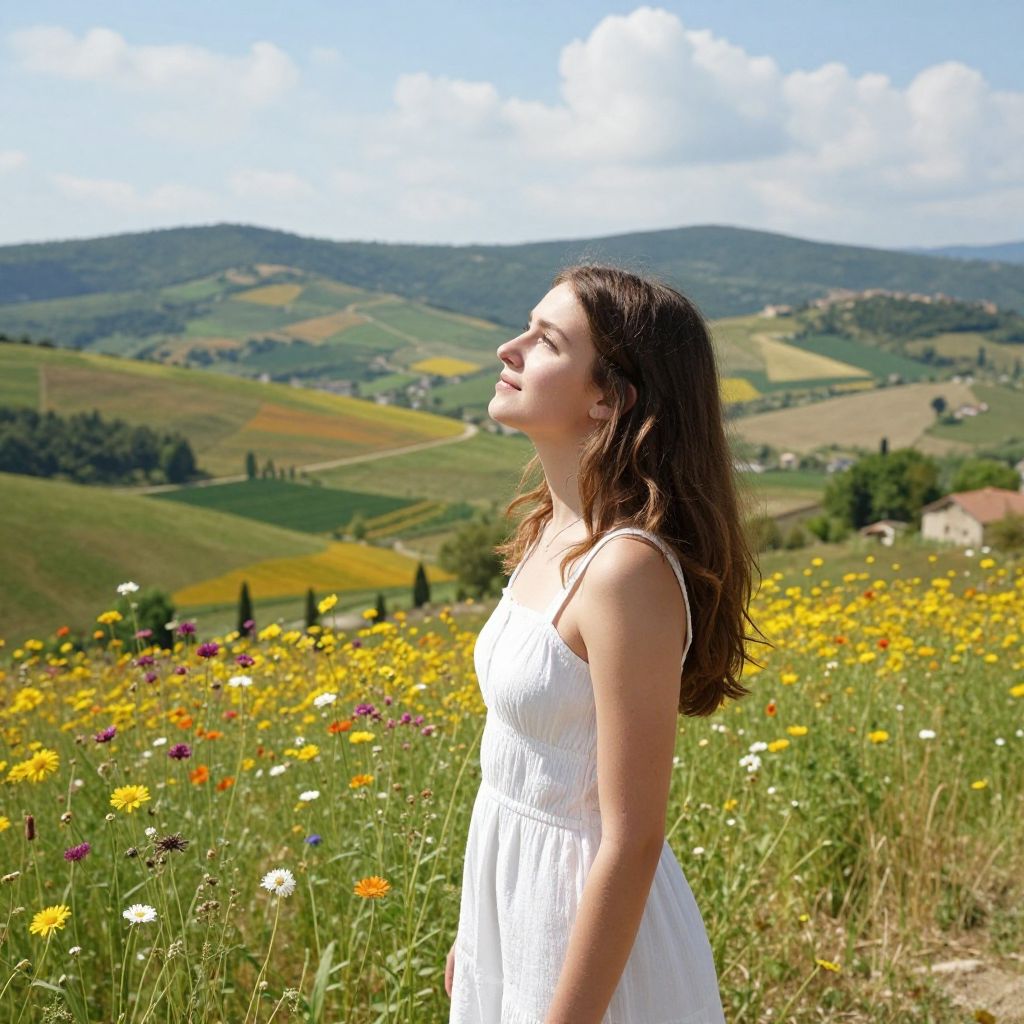 Embracing the boundless expanse of freedom and serenity, a young woman stands amidst a vibrant Italian valley, her gaze lifted toward the sky, as if inhaling the whispers of possibility and the gentle hum of summer's embrace.