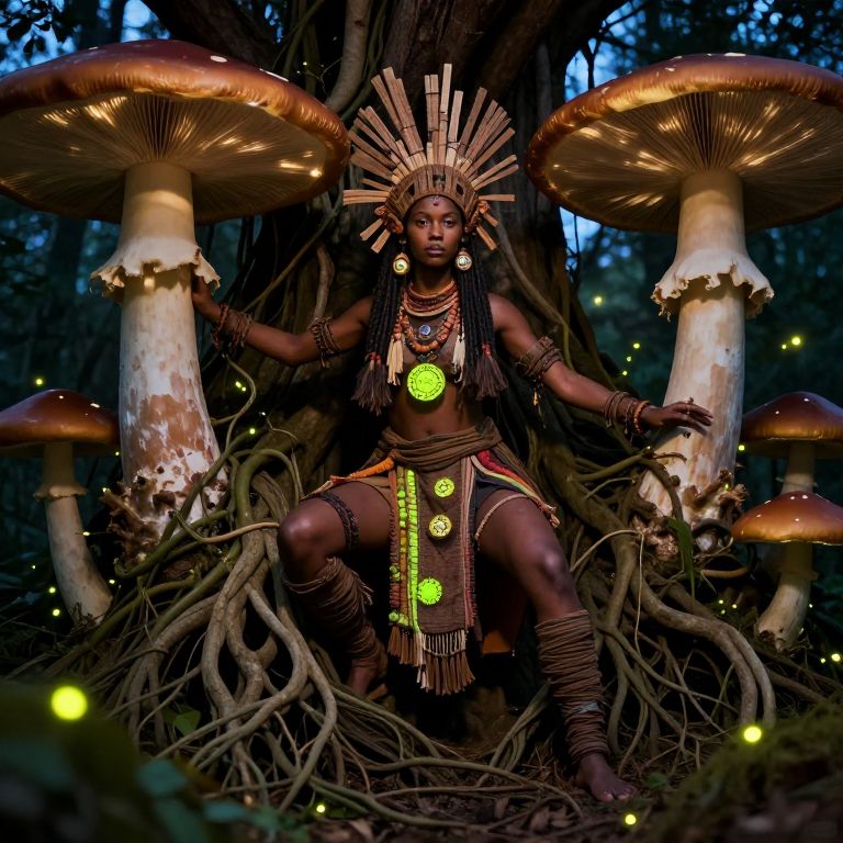 Photograph of a dark-skinned African woman with elaborate headdress, adorned in tribal jewelry and loincloth, sitting between giant mushrooms in a forest