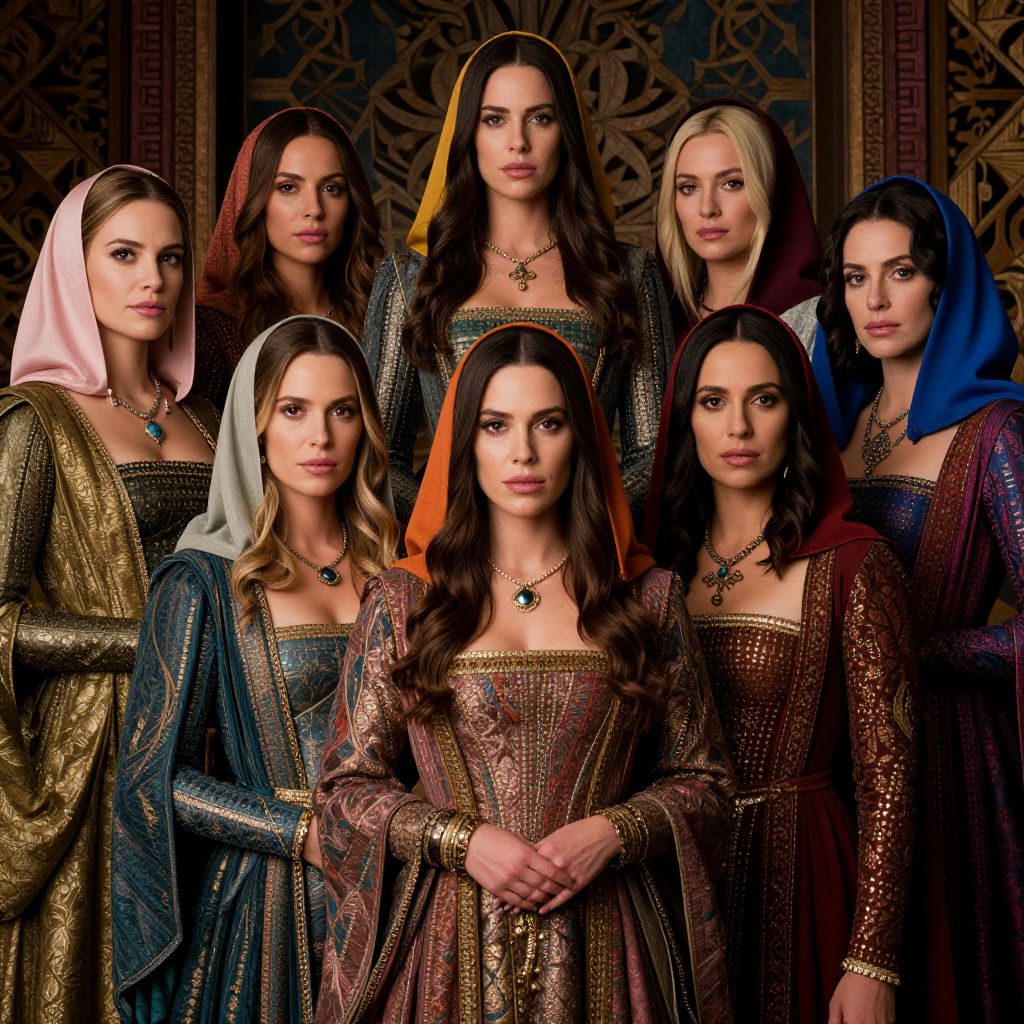 Photograph-style digital illustration of eight women dressed in medieval-style, ornate gowns with intricate gold and silver embroidery. They all have long, wavy hair, and are adorned with headscarves in various colors including pink, white, blue, and orange. The central woman, with dark brown hair and a gold dress, stands in front, hands clasped. The other women stand behind her, in dresses of blue, green, and red. All have serious expressions, and each wears a necklace with a pendant. The background features an ornate, dark wooden pattern. The image has a rich, medieval fantasy aesthetic.
