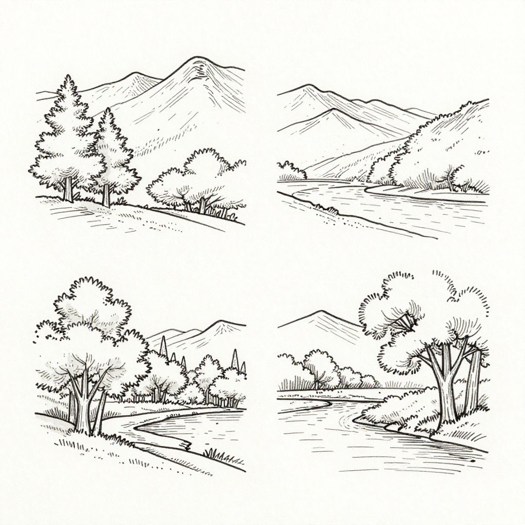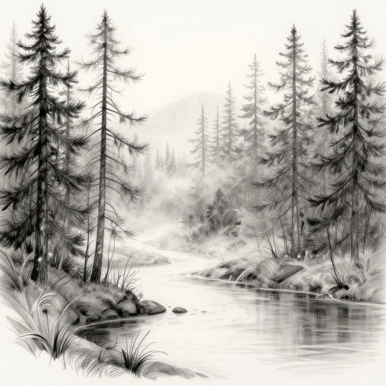 Convert image to sketch outline of a serene mountain landscape, emphasizing delicate pencil strokes and minimal shading, with snowy peaks and flowing rivers, capturing an artistic hand-drawn essence in black and white.