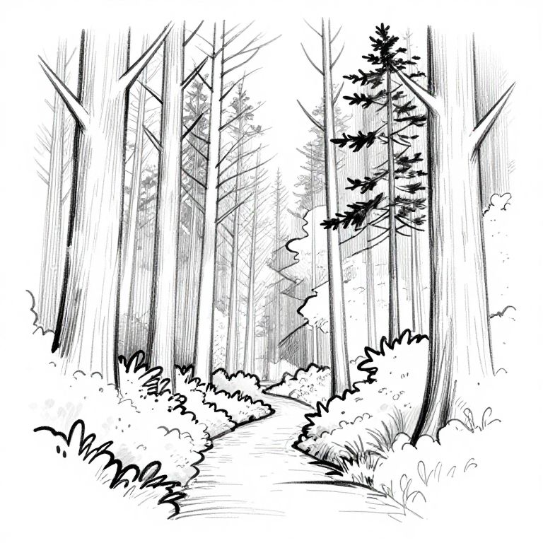 Black-and-white line drawing of a winding mountain road with evergreen trees, leading up to a jagged mountain peak.