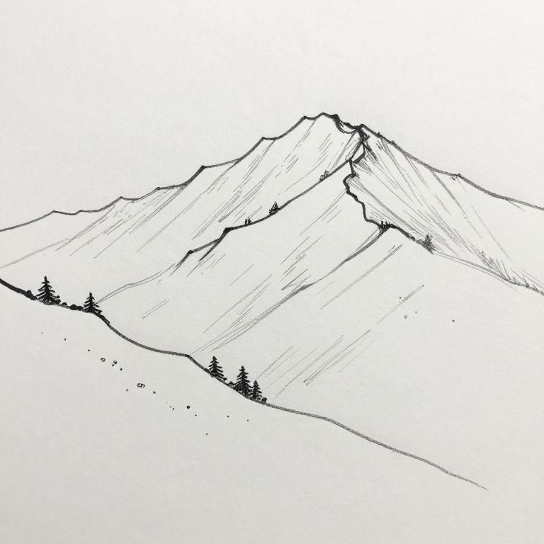 This is a black and white line drawing of a mountainous landscape. The image features steep, jagged peaks in the upper center, with a winding, serpentine road cutting through the lower mountains. Small clusters of pine trees are scattered across the hills, particularly concentrated in the lower left corner. The lines are crisp and precise, creating a stark, minimalistic contrast between the mountains and the white background. The overall style is reminiscent of traditional black ink pen drawings, emphasizing the natural contours and shapes of the landscape.