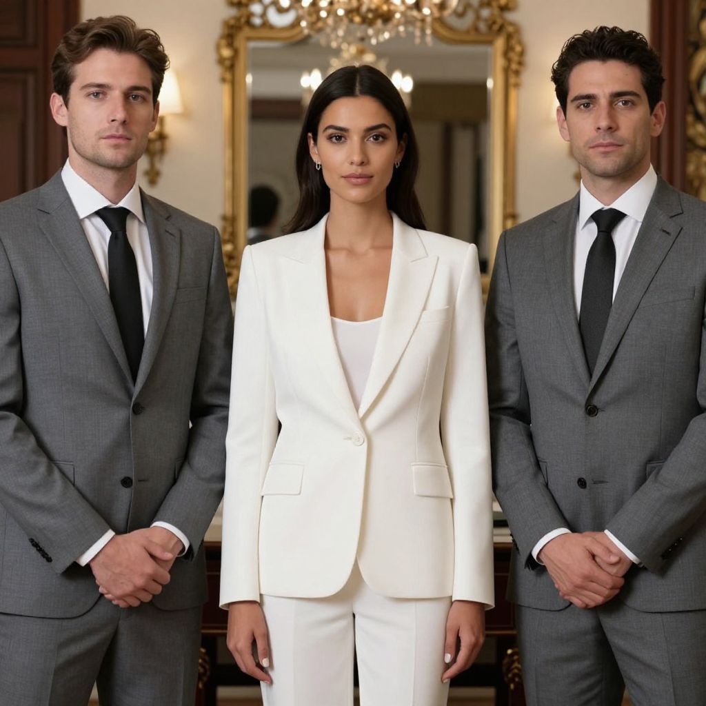 Elegantly dressed individuals stand in a sophisticated indoor setting, featuring a woman in a crisp white blazer positioned centrally, flanked by two men in gray suits, with warm lighting and ornate decor in the background.
