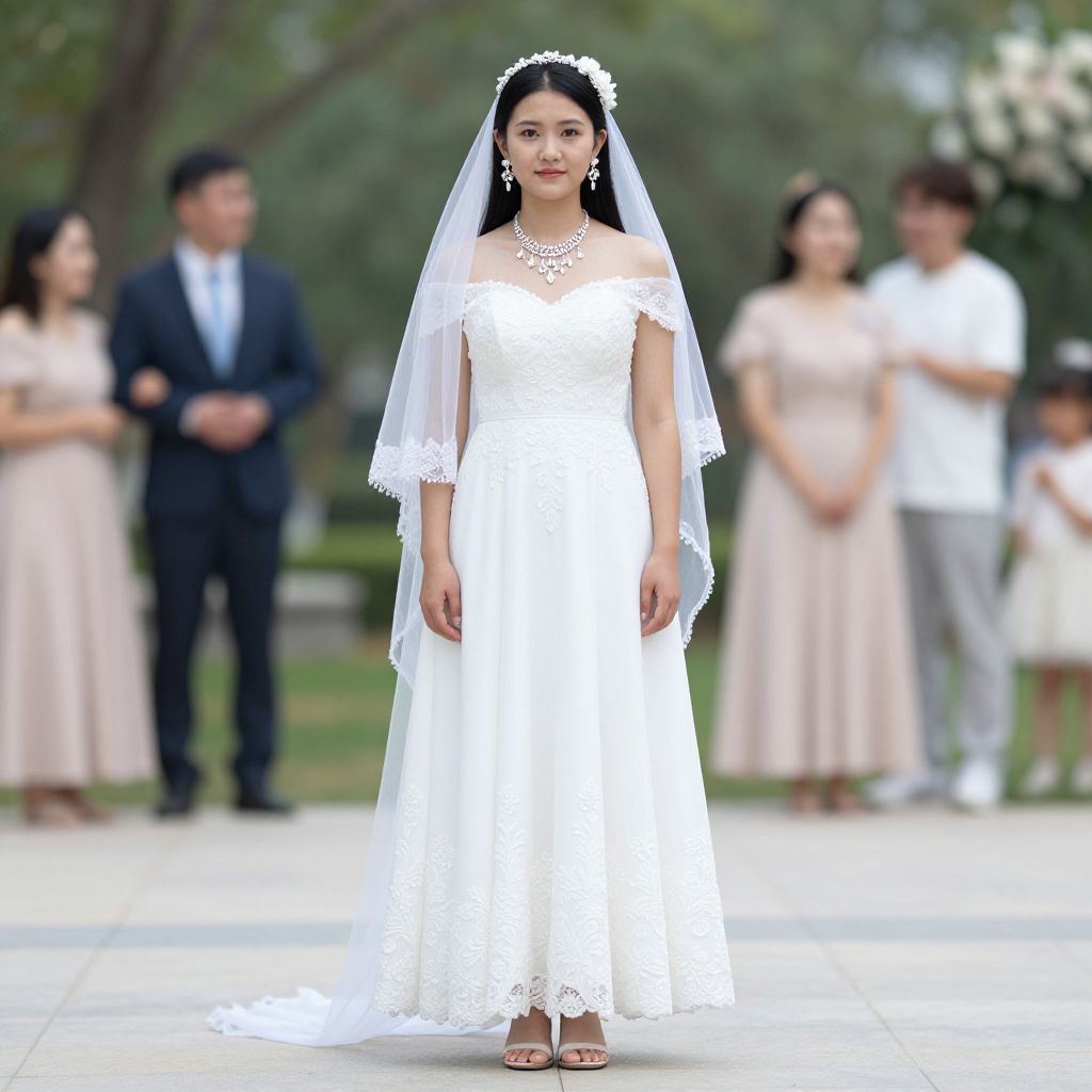 Summer wear marriage party, 1girl, dress, solo, jewelry, flower, veil, white dress, outdoors, earrings, sandals, long hair, wedding dress, full body, blurry, blurry background, black hair, necklace, standing, looking at viewer, hair ornament, hair flower, day, bridal veil, bare shoulders
