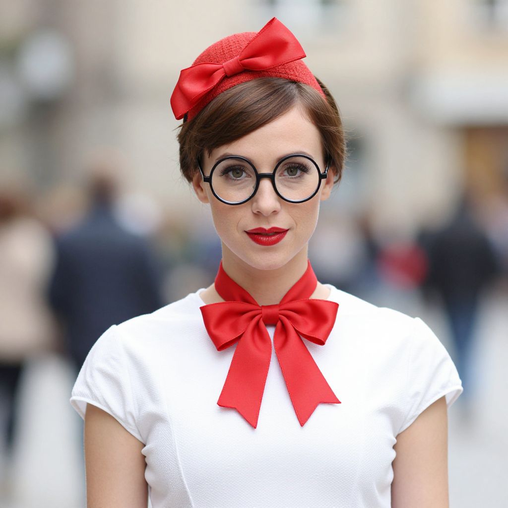 Mary poppins bert costume, 1girl, hat, blurry background, solo, brown hair, glasses, blurry, looking at viewer, bow, ribbon, outdoors, round eyewear, dress, red lips, red bow