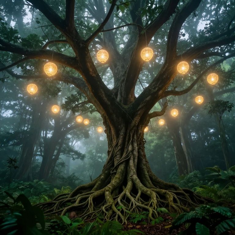 In a misty, enchanted forest, a majestic tree stands with its roots sprawling upwards into the air, adorned with luminous, glowing orbs that pulse like living lanterns, casting an ethereal light over the verdant landscape below.