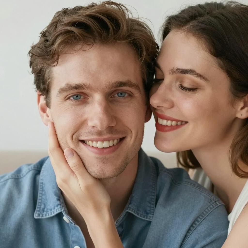 A shirtless man and woman lying in bed, facing each other. The woman has long black hair and fair skin, resting on white pillows with eyes closed. The man has short brown hair, fair skin, and a chest covered in hair, looking at her with a gentle expression. Their hands are intertwined, and white sheets partially cover them.