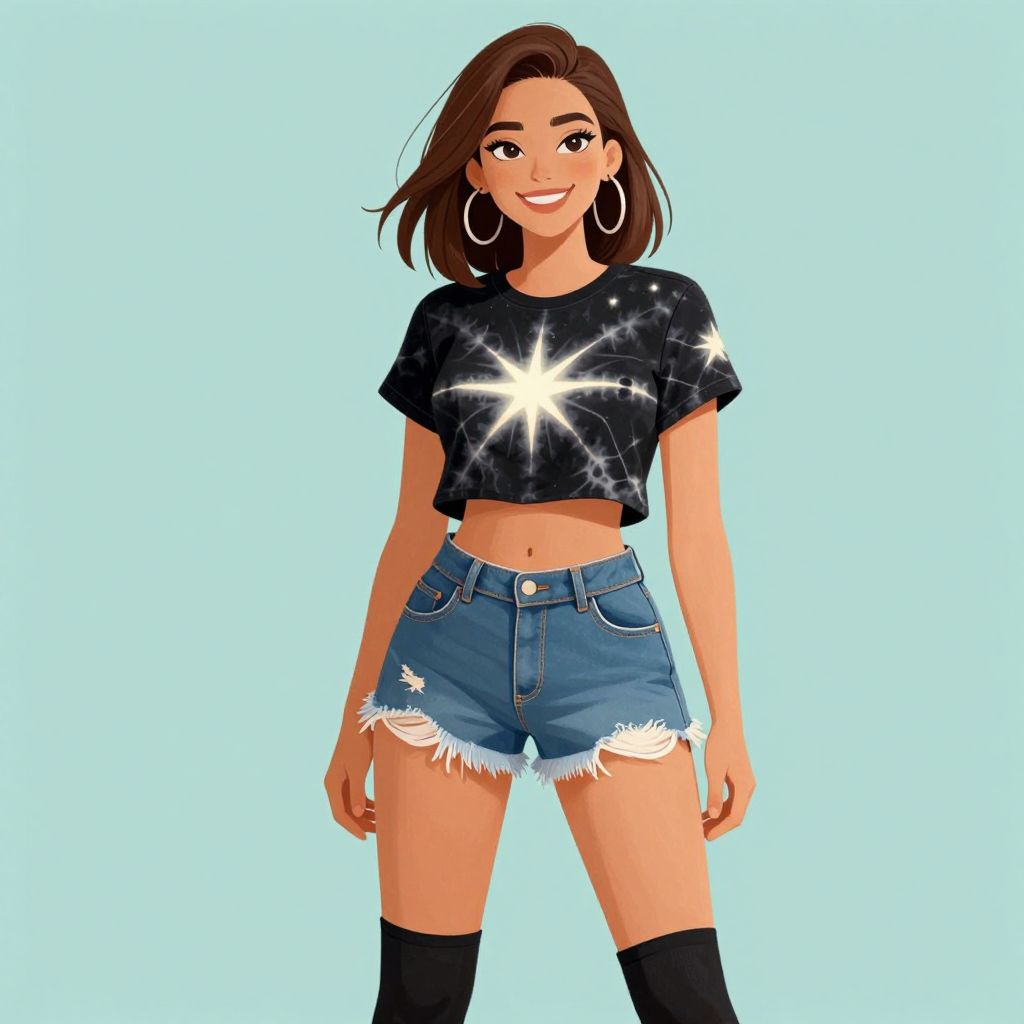 Digital illustration of a smiling young woman with medium-length brown hair, wearing a black tie-dye crop top with a glowing starburst design, and high-waisted, frayed denim shorts. She's also wearing black thigh-high socks and large hoop earrings. The background is a solid, light teal color. Her confident stance and friendly expression give her a lively, approachable vibe.