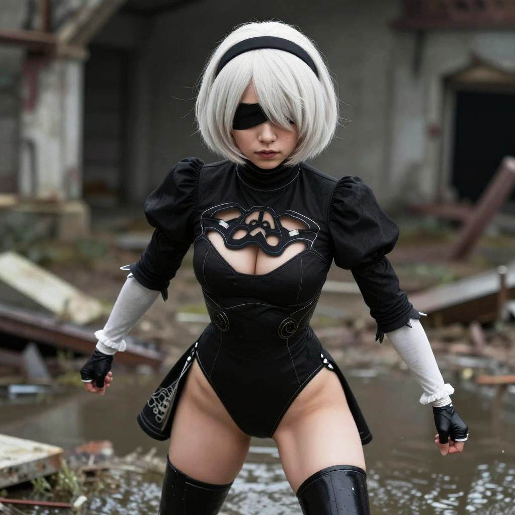Realistic cosplay of YoRHa No. 2 Type B (2B) from Nier Automata, featuring a female subject with white short hair, grey eyes, and a black hairband. She wears a black thong leotard with puffed sleeves, long white gloves, black thigh-high boots, and a black blindfold. The character is posed in a fighting stance in a flooded urban ruins setting with a blurred background, emphasizing detailed costume design and dynamic posture.