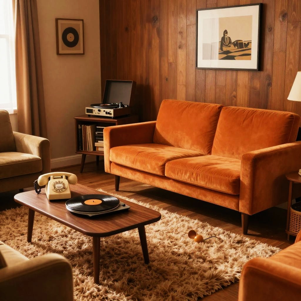 70er retro living room interior with orange and brown color scheme, shag carpet, wood panel walls, vintage furniture, rotary dial phone, and a record player spinning vinyl, evoking cozy and nostalgic 1970s home vibe.
