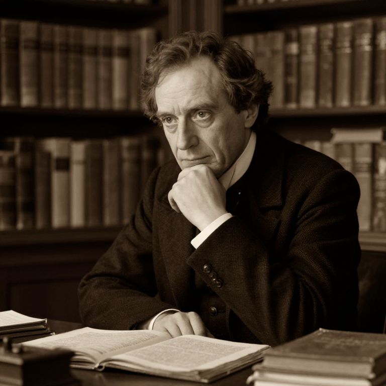 A sepia-toned photograph of an older man with wavy, dark hair and a contemplative expression. He is seated at a desk, resting his chin on his hand, wearing a dark, textured suit jacket over a white shirt. Open books and stacked papers are on the desk in front of him. The background features a blurred library with numerous bookshelves filled with books, creating a scholarly atmosphere. The lighting highlights his serious, introspective face, adding a vintage, timeless feel to the image.