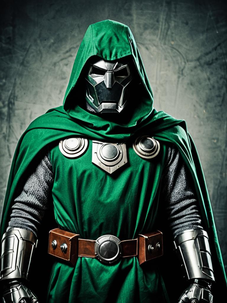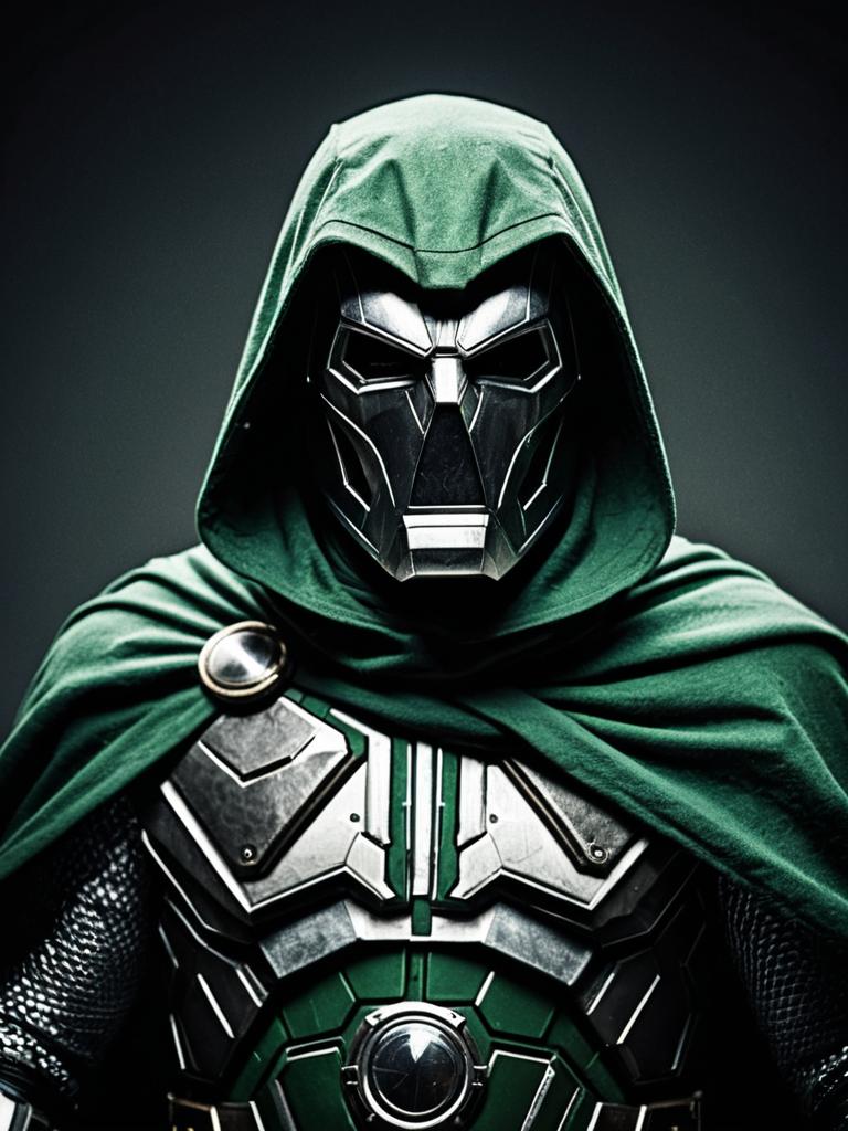 Man in Doctor Doom Costume, photorealistic studio portrait, sharp detail