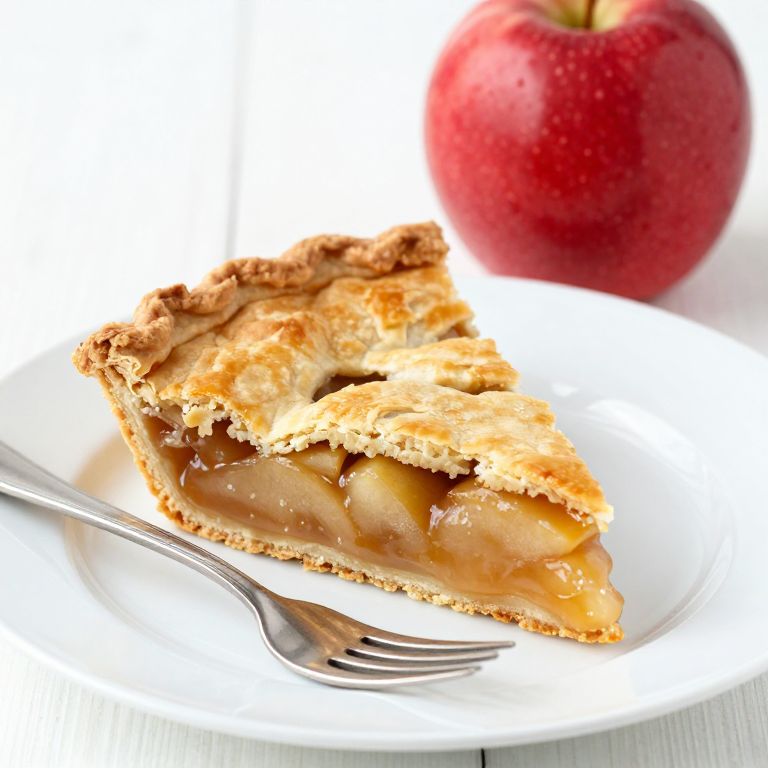 Golden slice of apple pie with flaky crust and caramelized filling rests on a white plate, accompanied by a silver fork and a vibrant red apple in the background.