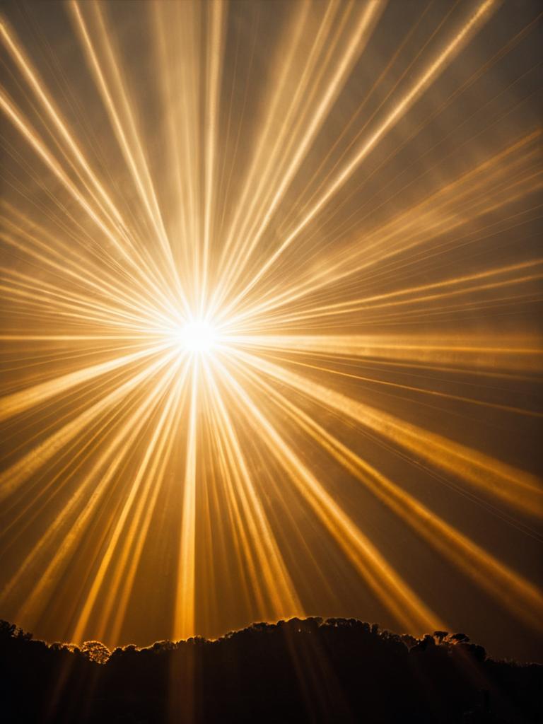 Silhouette of a woman standing under dramatic golden light rays in a dark space, creating a mystical and serene atmosphere. The woman wears casual-chic clothing with a cropped puff sleeve top, high-waisted wide-leg pants, and white sneakers. The background is plain and dark, emphasizing the striking beams of light.