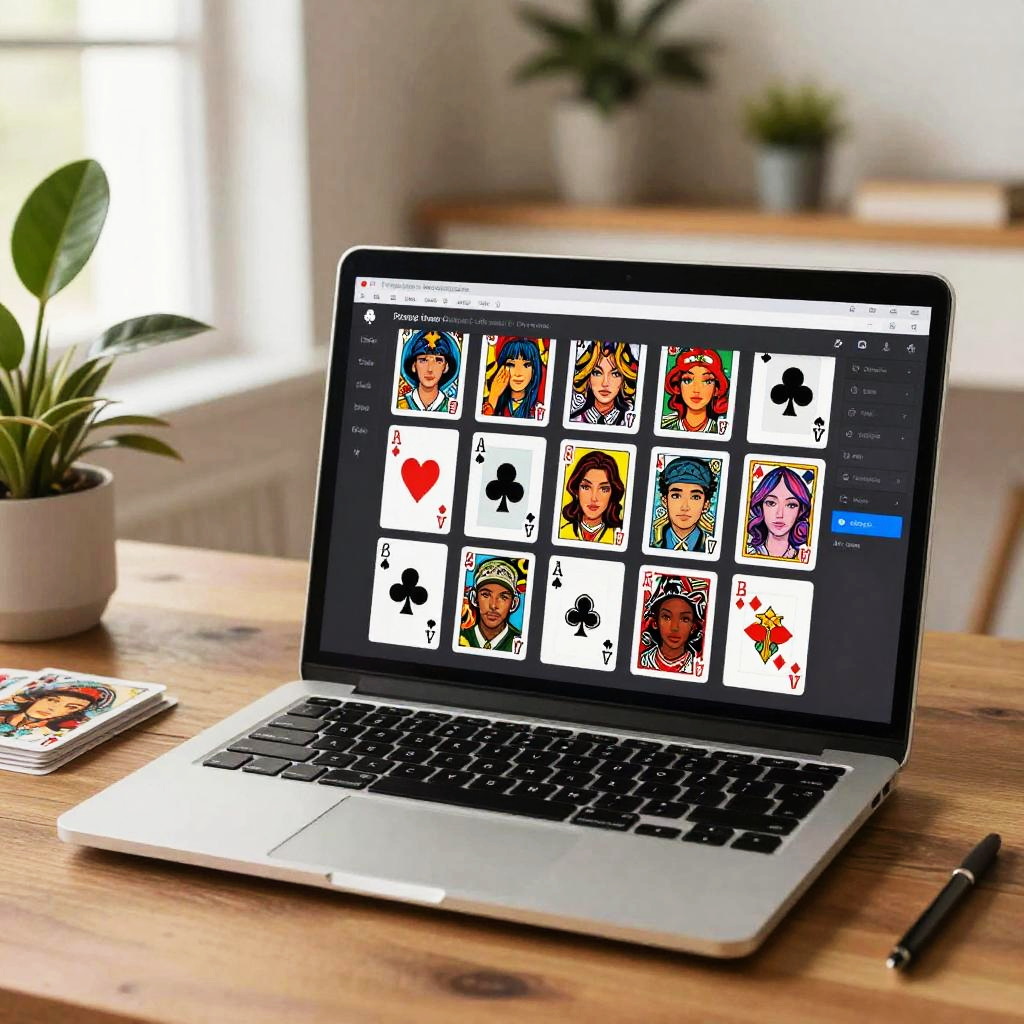Playing card maker free software interface on a sleek laptop screen, vibrant custom card designs with unique suits and faces, user-friendly UI, a cozy room with plants and bright ambient light, vivid and detailed digital art style