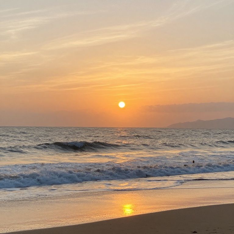 Photograph of a serene beach at sunset: orange sun sets over calm, gently rippling ocean waves, reflecting on wet sand, with a hazy