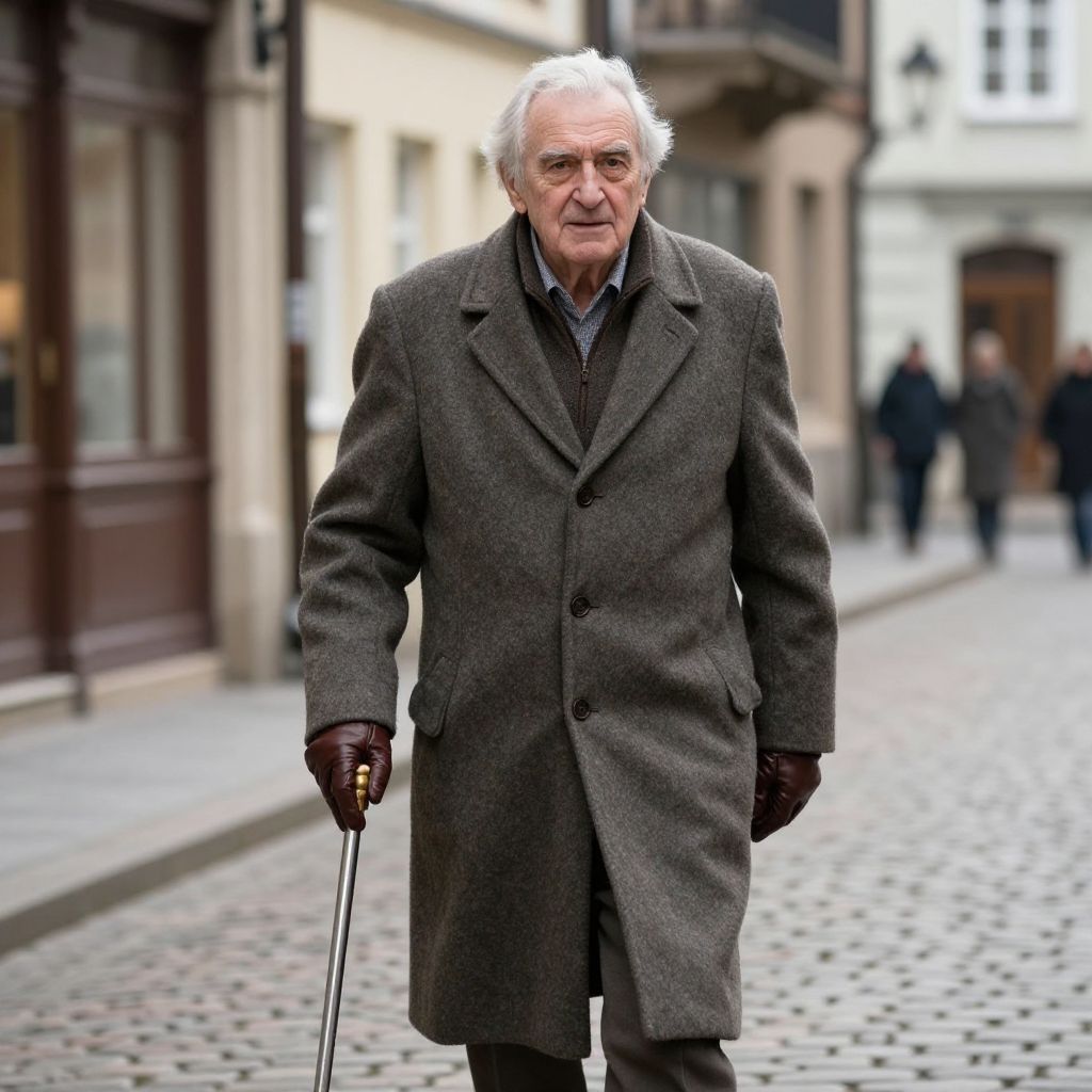 A serene elderly man with a weathered but wise face, wearing a classic wool overcoat and fine leather gloves, walking through a quiet, historic European street with cobblestones and vintage architecture, holding a silver walking cane, reflecting a timeless sense of high status in a traditional setting.
