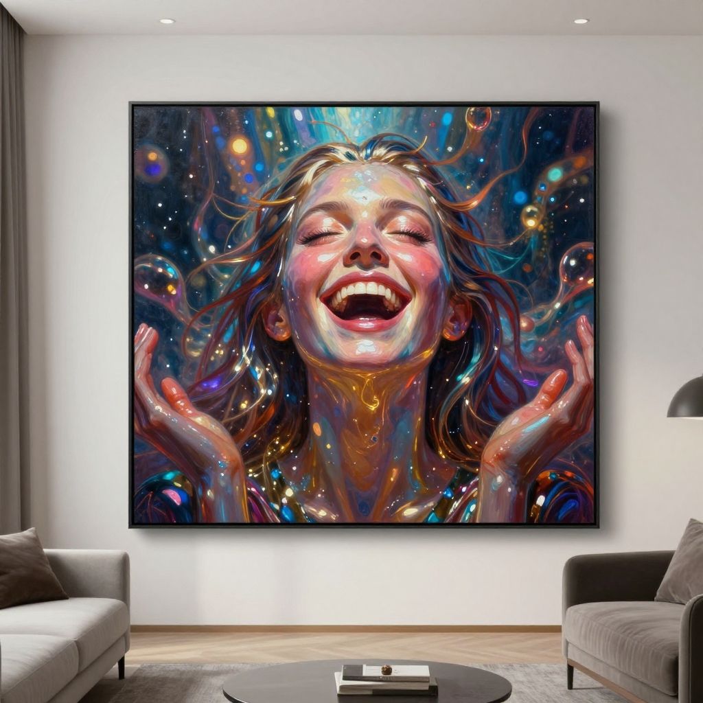 Vibrant, colorful abstract painting of a laughing girl with glowing hands, hanging in a modern living room with gray sofas.