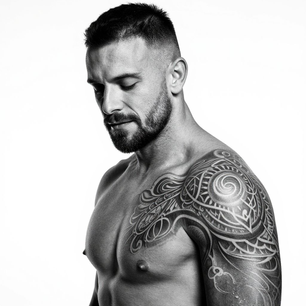 Photograph of a muscular, shirtless man with a buzz cut and trimmed beard. He has a large, intricate black tattoo covering his right shoulder and upper arm. His eyes are closed and he has a slight smile. The background is a stark white, contrasting with the dark tattoo. The image has a monochrome, high-contrast style.