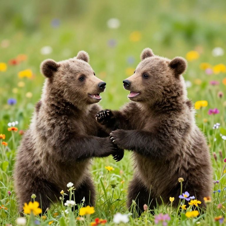 Bear cubs playing together in a sunny meadow filled with colorful wildflowers, joyful and playful expressions, vivid colors, detailed fur and soft lighting, warm and happy atmosphere, cute and heartwarming wildlife moment