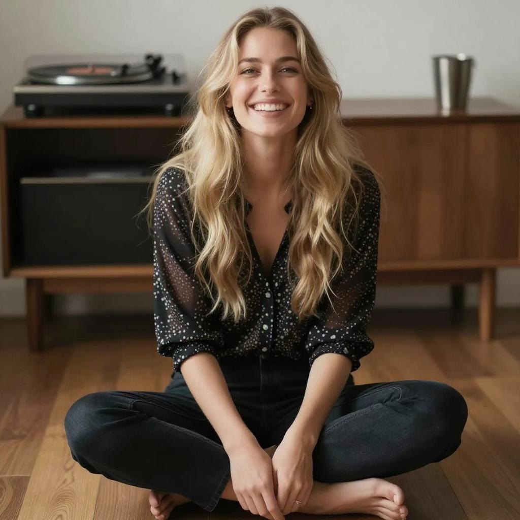 Photograph of a smiling blonde woman with long, wavy hair sitting on a wooden floor with her legs spread. She's wearing a black, patterned blouse and dark pants. The camera angle is slightly low and front-facing. Soft, natural lighting highlights her face. The background, including a wooden table with a record player and a metal cup, is slightly blurred with a shallow depth of field.