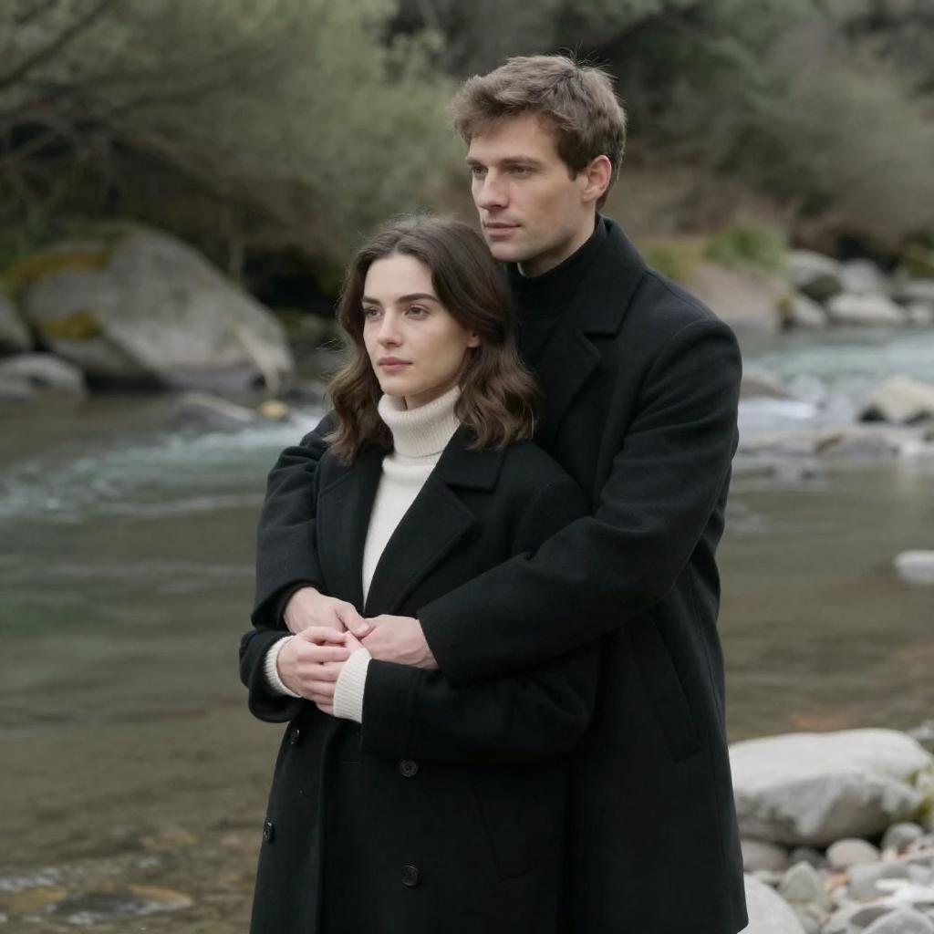 Photograph of a man with short dark hair in a black shirt standing behind a woman with pale skin and dark hair, wearing a white robe. The woman looks directly at the camera with a slight smile, while the man gazes intently forward. The background is dimly lit, creating a contrast with their brightly lit faces.