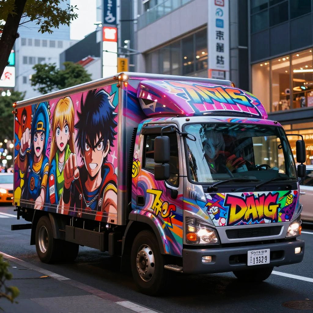 Futuristic truck wrapped in anime art, full of colorful characters with expressive faces and dynamic poses, sharp graffiti-like brush strokes, bright neon highlights, anime-inspired typography, parked on a bustling Tokyo street at dusk, digital painting with high contrast.