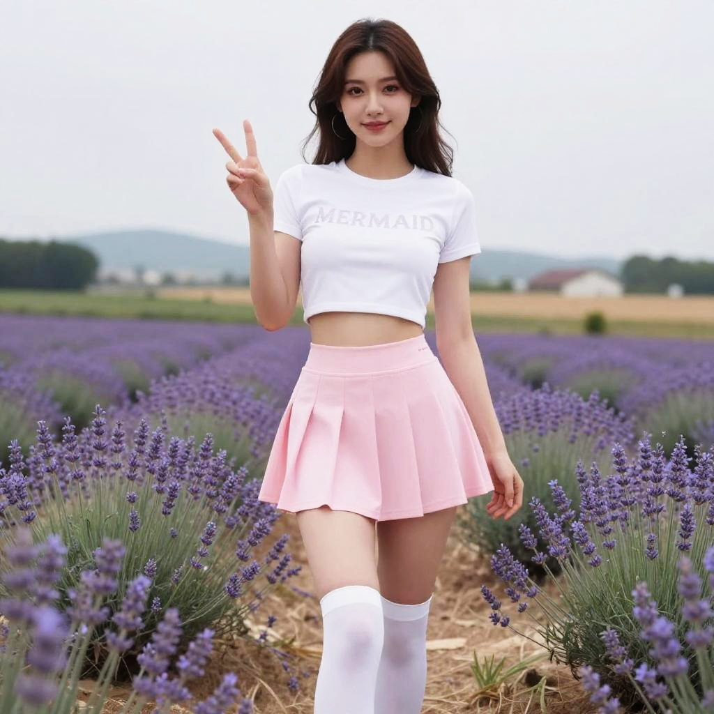 A Voluptuous woman in a selfmade hero style, wearing a white crop top with MERMAID text and a flared pink skater skirt, knee-high white socks, making a peace sign, standing in a countryside scene in a lavender field. Sexy. Pretty face and beutiful eyes
