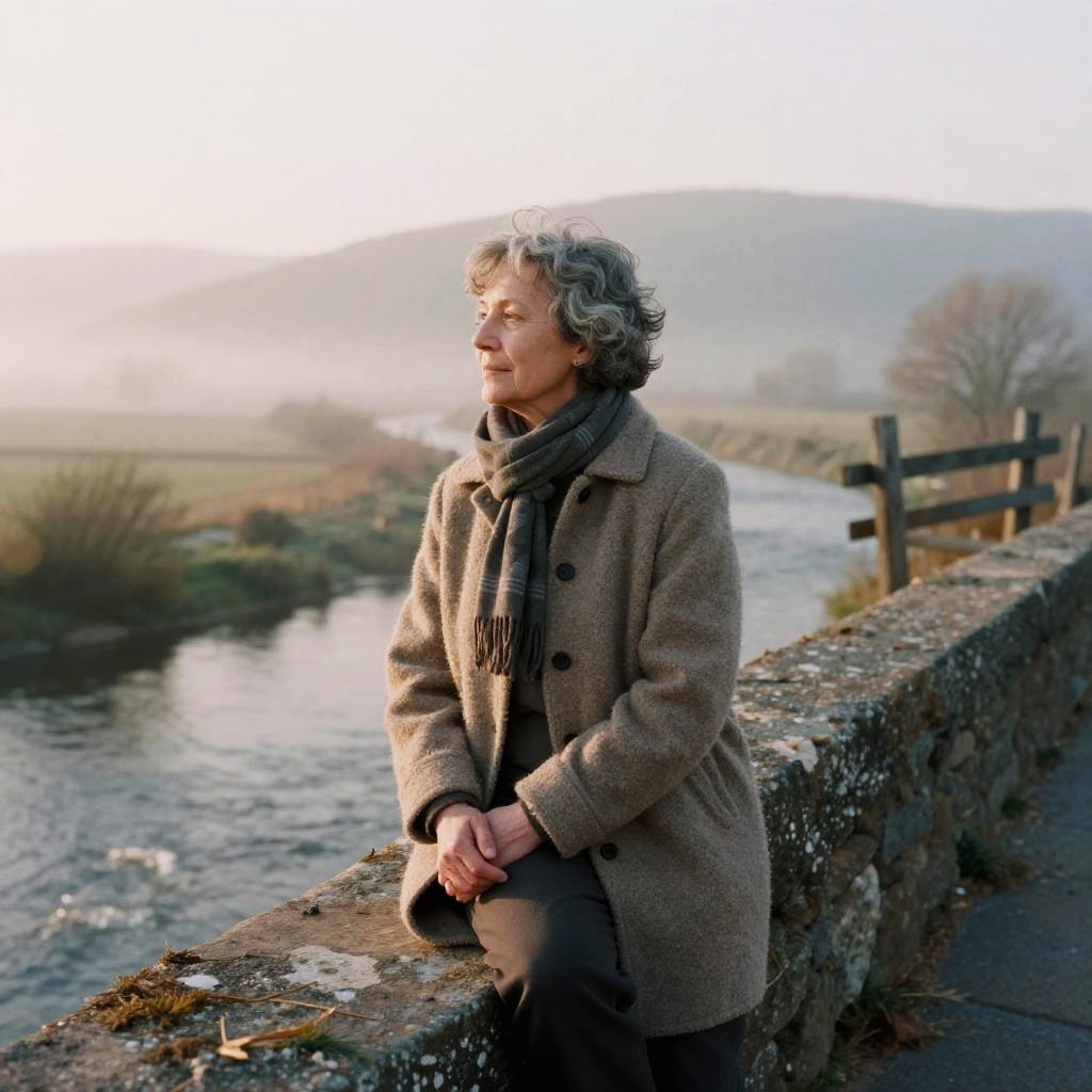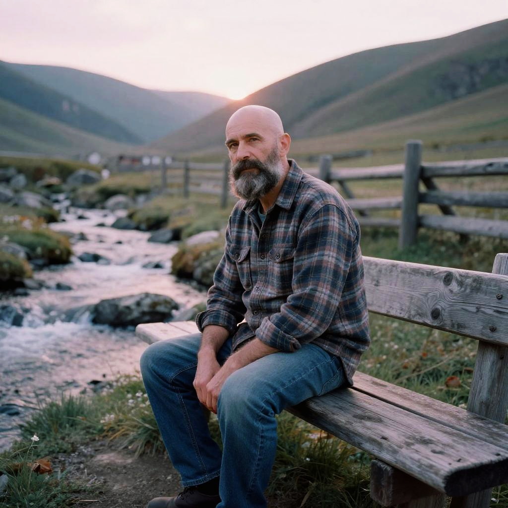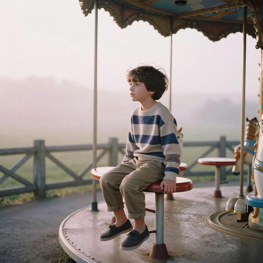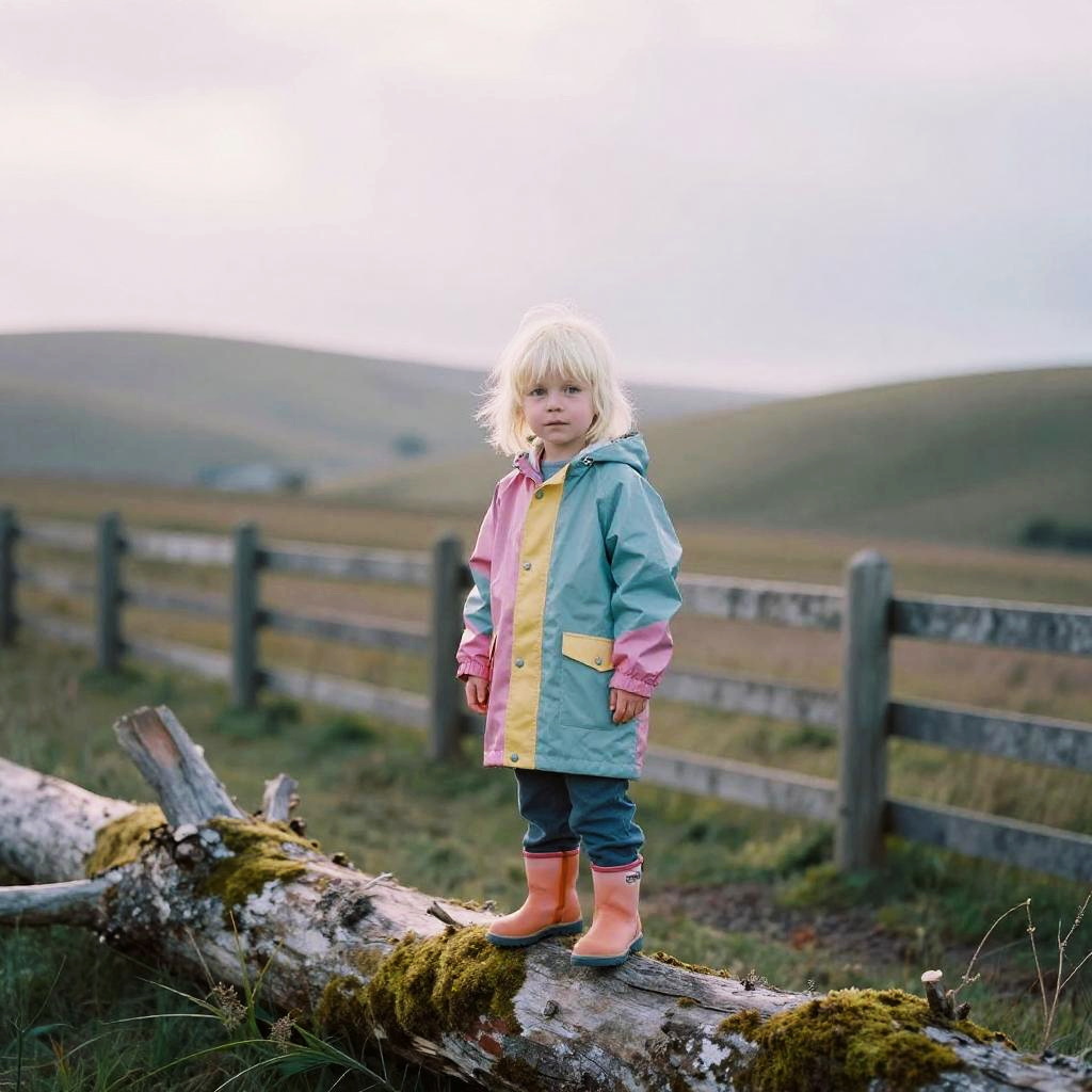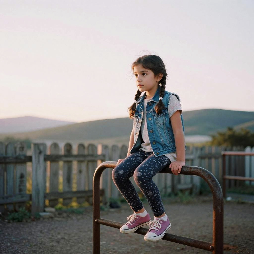 A young woman with platinum blonde pixie cut in a red leather jacket and black jeans perches on a graffiti-covered rooftop ledge overlooking the city skyline at midnight blue hour, cinematic 35mm film look, ethereal pastel sunlight, shallow depth of field with bokeh, soft grain texture, gentle pastel tonal palette, with distant rolling hills and a weathered wooden fence in the background.