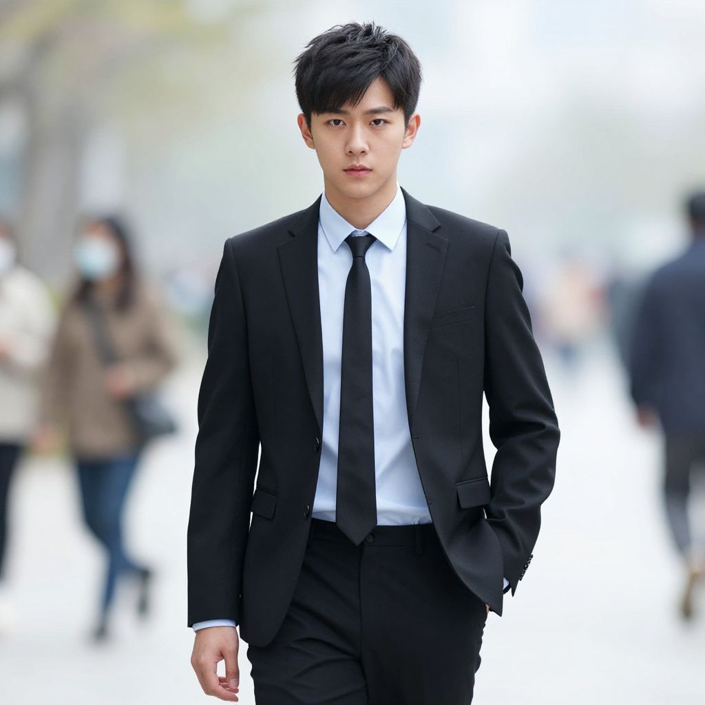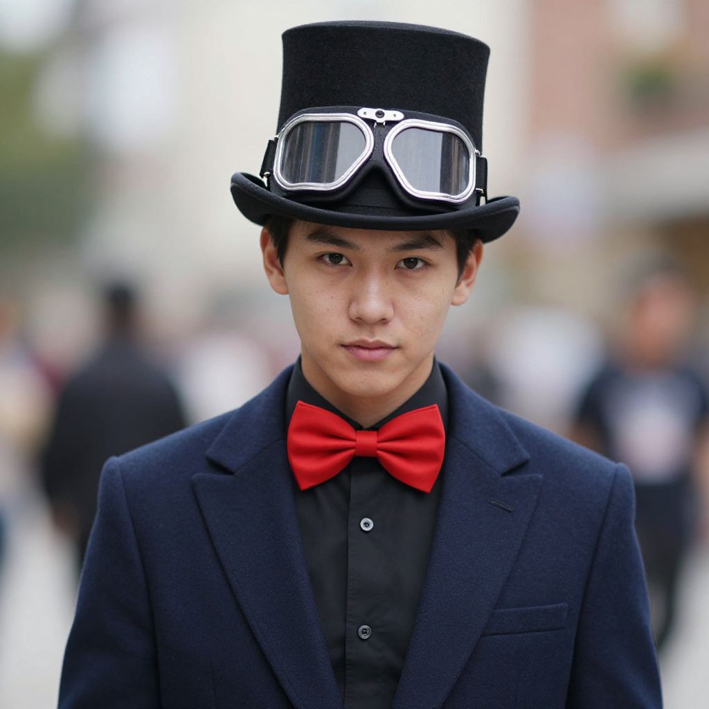 Young Asian man in black top hat with goggles, red bow tie, black suit, standing outdoors, blurred background, street scene.