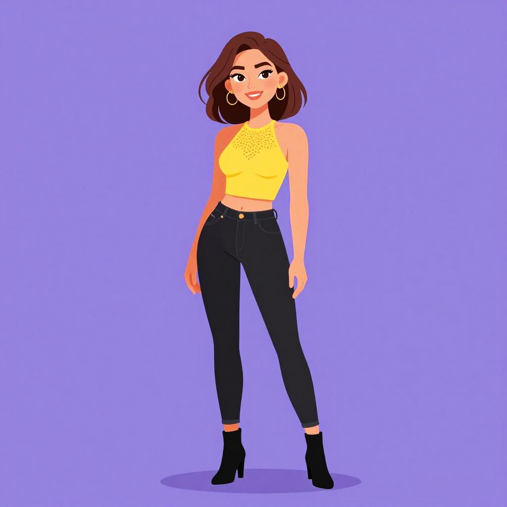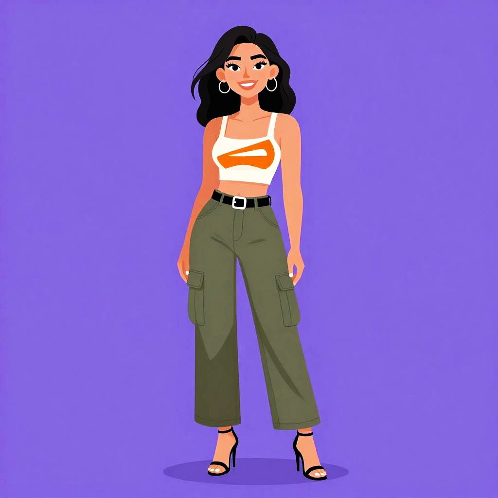 Illustration of a confident young woman with long black hair wearing a white and orange graphic crop top with a square neckline, paired with high-waisted olive green cargo pants featuring side pockets and a black belt. She is also wearing black stiletto sandals and hoop earrings, standing against a solid purple studio background, smiling.