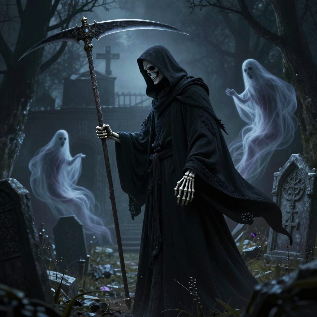 Grim reaper side profile with flowing dark robe, skeletal hand gripping a scythe, surrounded by swirling ghostly spirits in an ancient graveyard at night
