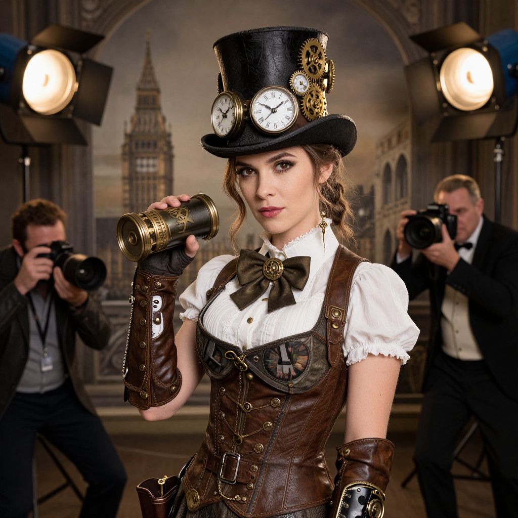 Photograph of a young woman with fair skin and brown hair styled in loose curls, wearing a black top hat adorned with a clock and gear. She has brown eyes and wears a white blouse with puffed sleeves, a dark brown corset, and brown leather gloves. She holds a brass flask in her right hand. Behind her, two photographers in black suits and ties capture her image with cameras. The background features an ornate, dimly lit room with large windows and a detailed clock tower painting. Bright studio lights are positioned on either side. The overall style is steampunk with a vintage, Victorian aesthetic.