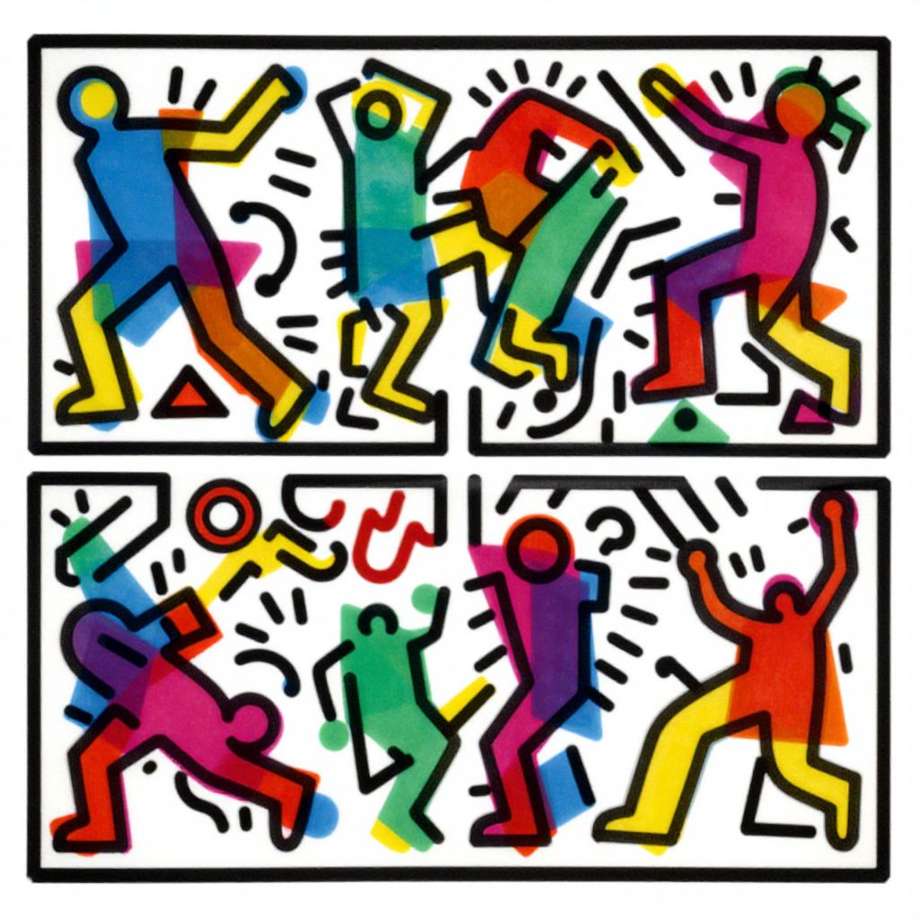 Dynamic Keith Haring wallpaper design displaying interconnected human figures in motion, filled with bright primary colors and geometric shapes, evoking the spirit of 1980s New York street art with a modern, graphic flair.
