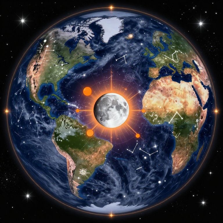 Celestial map encircles Earth, showcasing a vibrant array of constellations and stars, with the moon positioned centrally, surrounded by radiant orange orbs and intricate astrological symbols.
