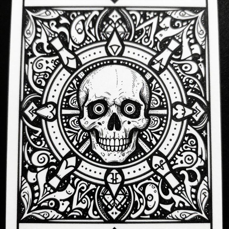 The image is a highly detailed, black and white drawing that resembles a tarot card, with intricate designs and symbols. The central figure is a skull with large, expressive eyes, surrounded by elaborate, swirling patterns and geometric shapes. The skull is encircled by a series of interconnected symbols, including a diamond, a heart, a club, and a spade, each adorned with additional decorative elements. The background features a complex array of ornate designs, including floral motifs, abstract shapes, and stylized figures, creating a sense of depth and movement. The overall composition is balanced, with the skull at the center, flanked by symmetrical patterns that extend outward, giving the image a sense of harmony and balance. The use of negative space and the interplay of light and shadow enhance the visual impact, making the intricate details stand out against the dark background.