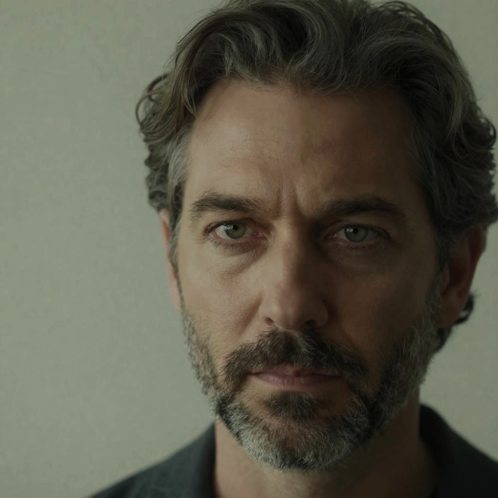 Photograph of a middle-aged man with light skin and brown hair, wearing a brown suit jacket over a white shirt. He is thinking, with his right hand touching his lips. Dark, blurry background with circular bokeh lights. Tree trunk on the right. Intense, contemplative facial expression.