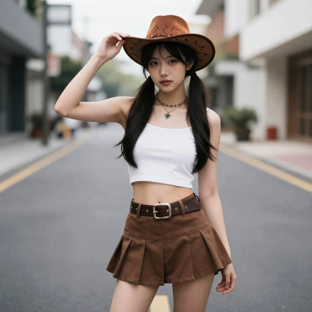 Rock Roll Costume Girl, girl in a cowboy outfit and hat standing on a street