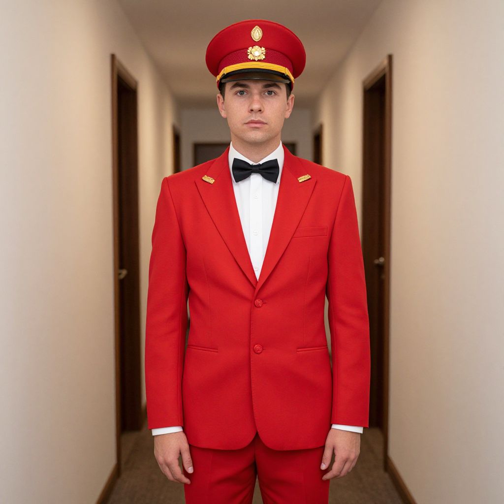 Bellhop costume, man in a red suit and hat standing in a hallway