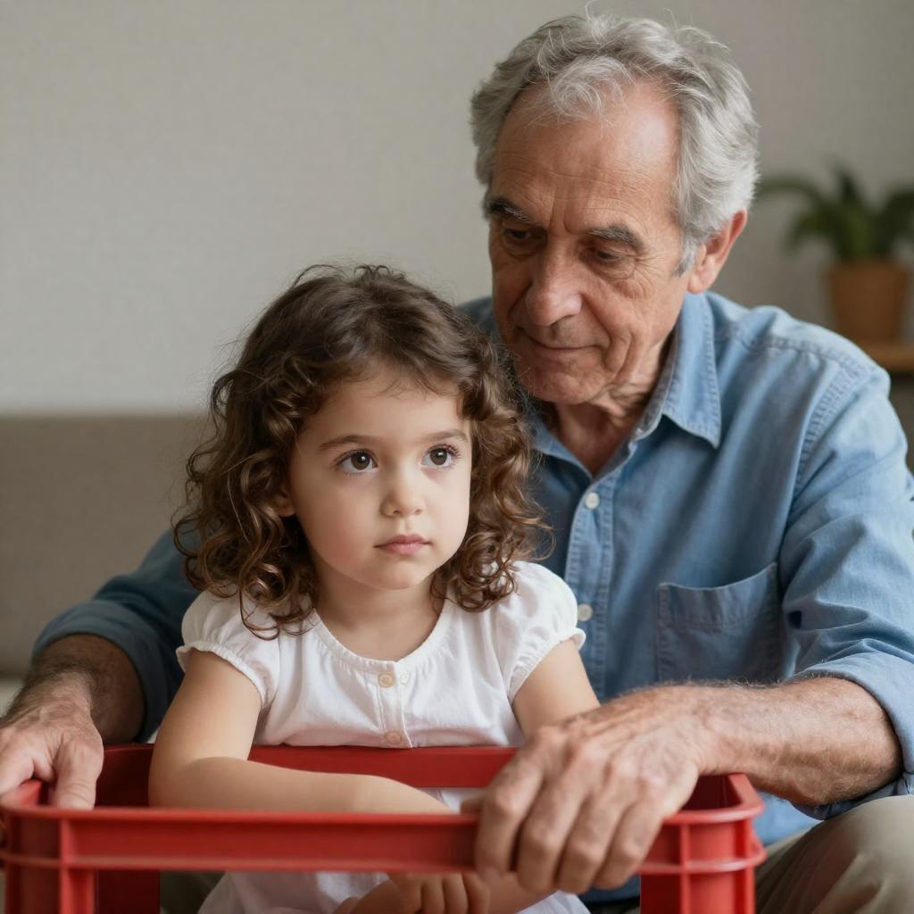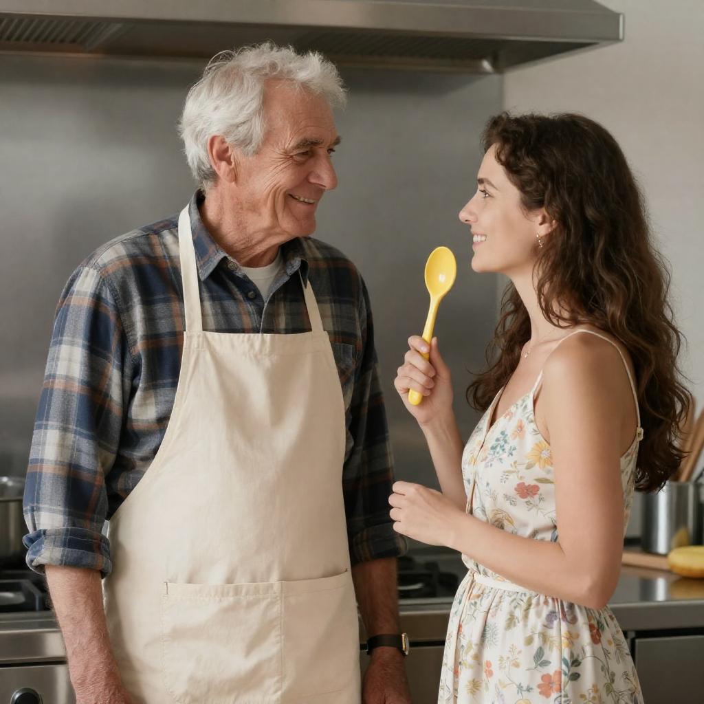 Old man with white hair, green shirt, sitting on couch, eyes closed. Young woman with short brown hair, purple top, kissing his cheek. Couch with red and green cushions, books on wooden table in background. Soft, natural light. Woman's right hand on man's arm. Casual, intimate moment.