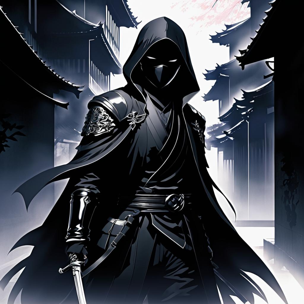 A mysterious figure dressed in tattered black robes adorned with arcane runes and red sashes walks through an abandoned, ruined city shrouded in mist. The shadowy caster, hooded and faceless, commands smoky raven spirits flying around amidst decayed buildings and debris. The dark fantasy scene is illustrated in the vibrant and spiritual anime style, evoking a mystical and eerie atmosphere.